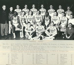 1954-1955 Men's basketball team. Back row: Coach Longfellow, Assistant Coach Paul Stemm, J. Walker, *S. Marginet, J. Harkness, Don Bates, *Emory Molnar, Max Call, H. Smith. Middle row: J. Bridgeforth, *T. Myers, *R. Blackburn, B. Cripe, J. Lee, W. Parker, B. Sisk, H. Thomas, Mgr. Front row: F. Dunnuck, *J. Smith, J. Cox, P. McAlearney, Mgr. *Withdrew from school or squad at end of first term. The following players not in picture completed the season: J. Bates, G. Williams, Pete Pritchett, and Paul Wolf who coached team after first term.