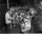 Coach Bill Jones talking to players in locker room. October 3, 1959.