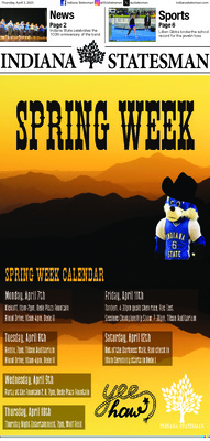 Spring Week; Spring Week Calendar; Indiana State Out of the Darkness Walk; 100 years of Sycamore Bands; President Godard cooks at George’s; Mathematics Dept. screens ‘Counted Out’; Causes of Taliban control in Afghanistan